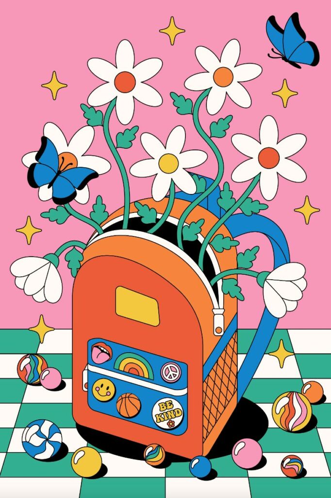 L’élément incontournable de la rentrée, le cartable ! Cette image réalisée par Gabor Estefan, adopte un style résolument pop et vectoriel. Les aplats de couleurs franches (rose vif, orange éclatant, bleu saturé), créent une ambiance ludique et dynamique. La composition est centrée sur un sac à dos, duquel jaillissent de grandes marguerites blanches, symbole de fraîcheur et d’optimisme.