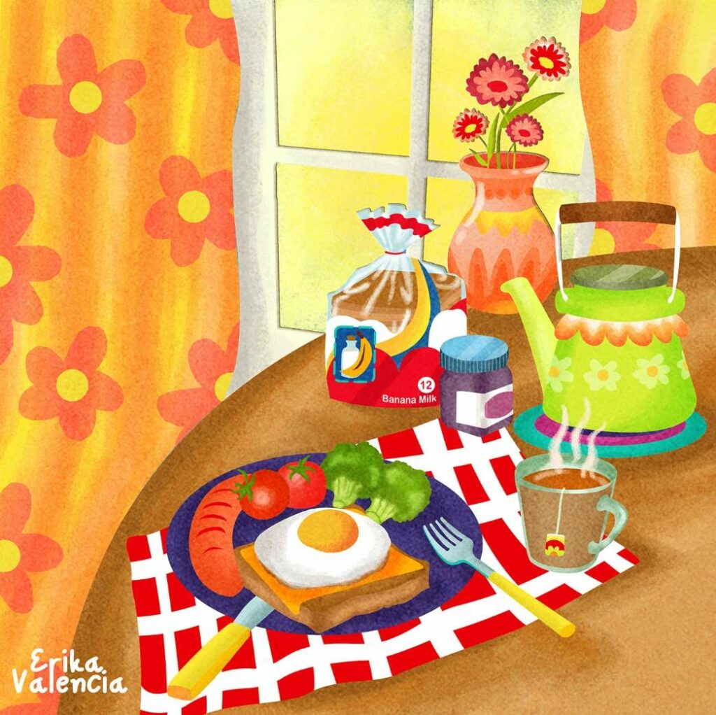 Quoi de mieux qu’un bon petit-déjeuner pour bien commencer la rentrée ! Cette illustration d’Erika Valencia capture un moment chaleureux et réconfortant du matin. Le style est coloré et texturé, avec des aplats doux qui rappellent l’aquarelle. La lumière diffuse par la fenêtre crée une atmosphère paisible, évoquant la douceur des premiers instants de la journée.